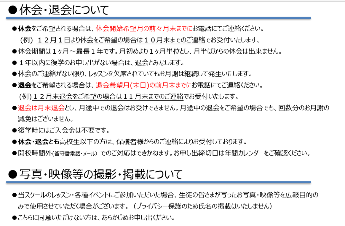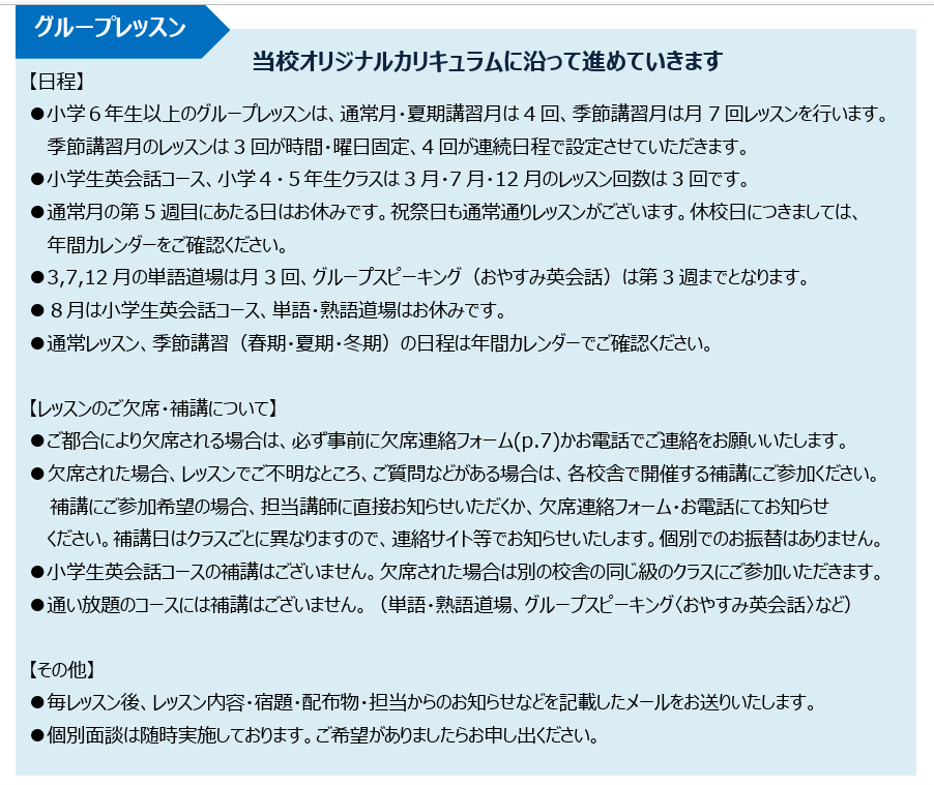 小学6年生以上のグループレッスンは、通常月・夏期講習月(8月)は4回、季節講習月は月7回レッスンがあり、月ごとにお月謝が変更になります。(季節講習月は1週目~3週目の3回が通常レッスン設定時間、季節講習の4回が連続日程で設定させていただきます)