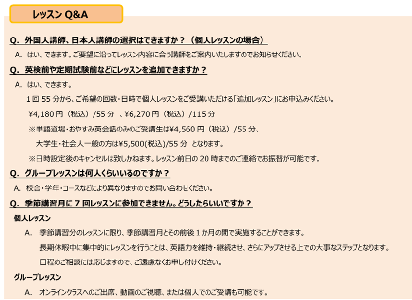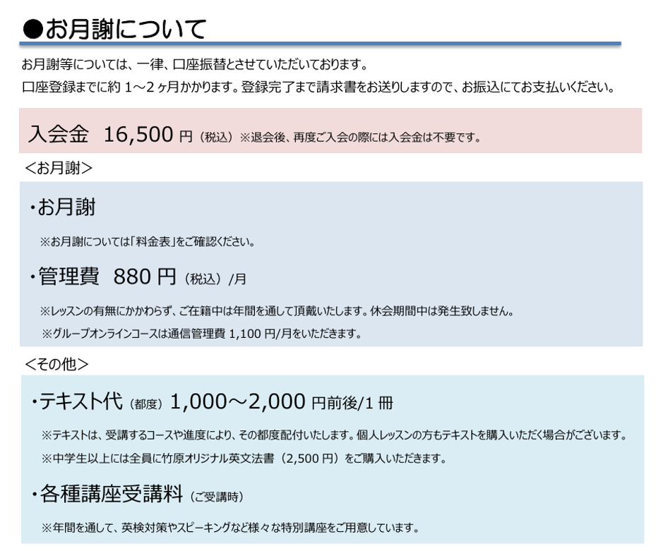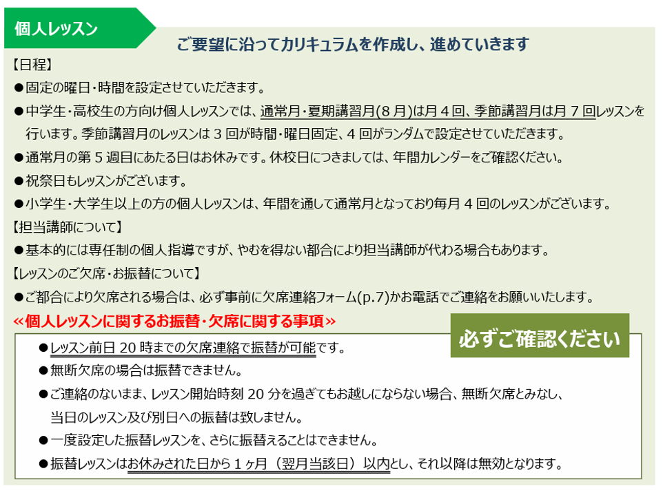 中学生・高校生の方向け個人レッスンでは、通常月・夏期講習月(8月)は月4回、季節講習月は月7回レッスンがあり、月ごとにお月謝が変更になります。(季節講習月のレッスン1週目~3週目の3回が通常レッスン設定時間、季節講習の4回がランダムで設定させていただきます。(3か月間の間))